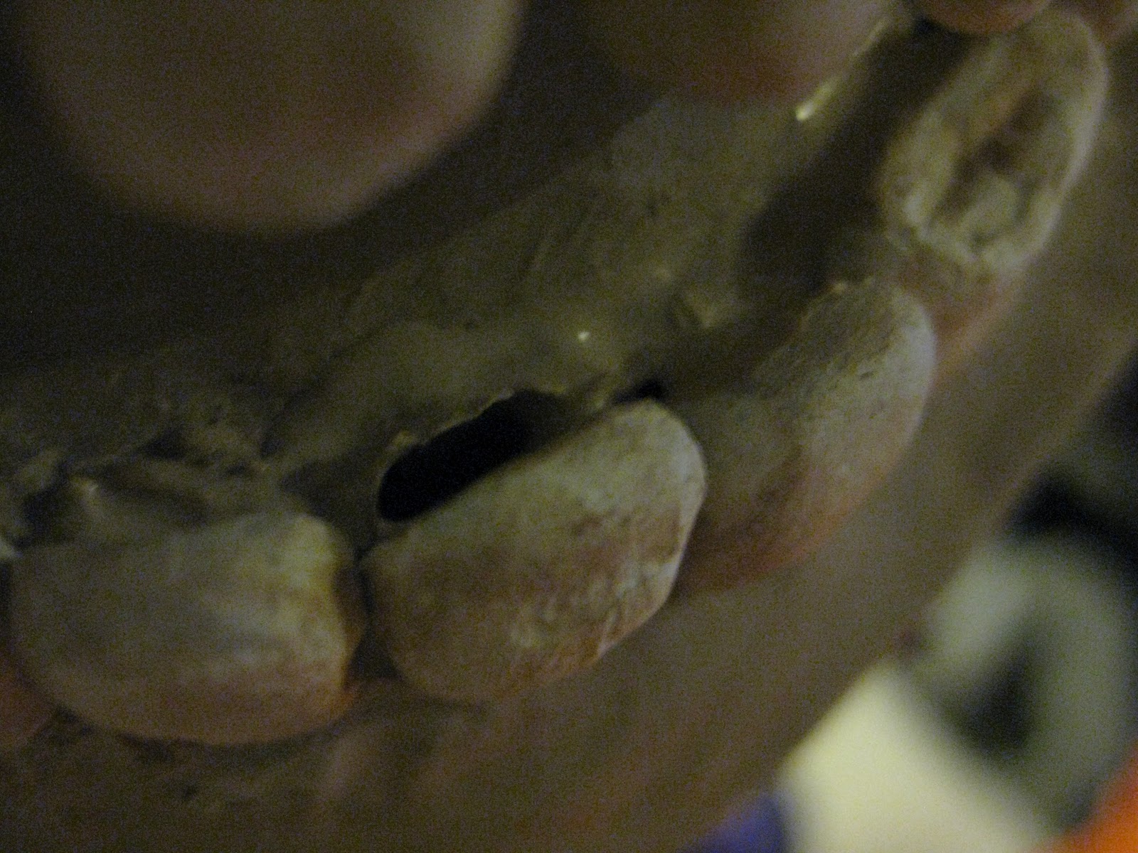 I made them bright white as described in the book but they looked a little absurd so I dulled them down a bit to make them look a little more 'dead'. Also, because I made new teeth, the width of some of them weren't the same as before so when I glued them in place, there was a gap at the back. I used the bone coloured latex to fill in these gaps:
